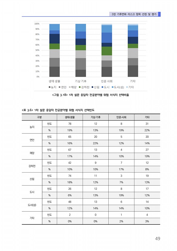 3장 기후변화 리스크 항목 선정 및 평가 49 구분 생태?생물 기상?기후 인문?사회 기타 농지 빈도 78 12 8 31 % 19% 13% 19% 22% 연안 빈도 65 20 5 20 % 16% 22% 12% 14% 해양 빈도 67 13 4 27 % 17% 14% 10% 19% 강하천 빈도 42 9 7 12 % 10% 10% 17% 8% 산림 빈도 74 11 3 19 % 18% 12% 7% 13% 도시 빈도 26 12 8 17 % 6% 13% 19% 12% 도서 섬 빈도 48 13 6 14 % 12% 14% 14% 10% 기타 빈도 2 0 1 4 % 0% 0% 2% 3% 표 3.6 1차 설문 응답자 전공분야별 위협 서식지 선택빈도 그림 3.18 1차 설문 응답자 전공분야별 위협 서식지선택비율