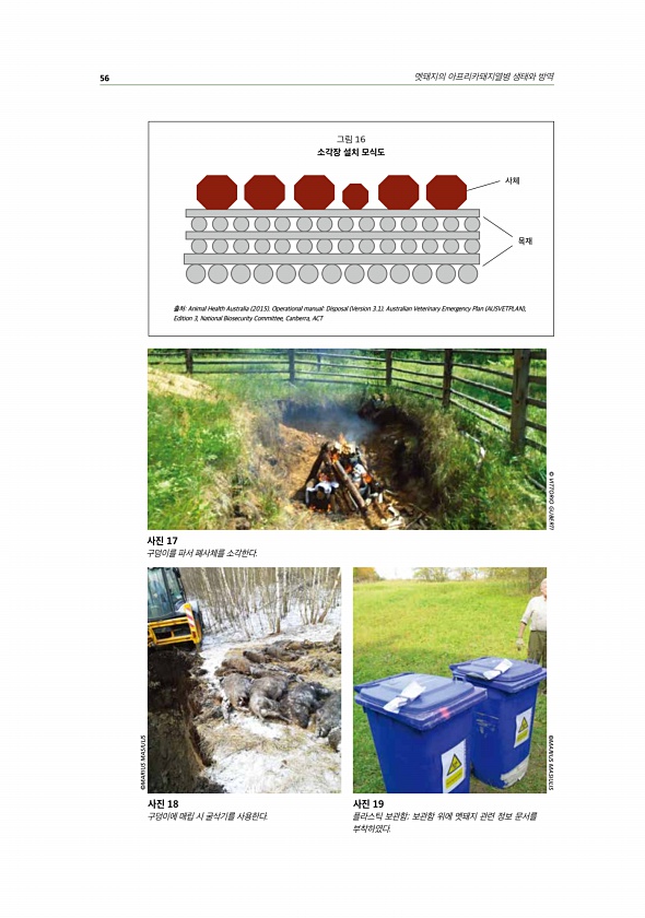 56 멧돼지의 아프리카돼지열병 생태와 방역 사체 목재 그림 16 소각장 설치 모식도 출처Animal Health Australia 2015 Operational manualDisposal Version 3.1 Australian Veterinary Emergency Plan AUSVETPLAN , Edition 3, National Biosecurity Committee, Canberra, ACT 사진 17 구덩이를 파서 폐사체를 소각한다. ? VITTORIO GUBERTI 사진 18 구덩이에 매립 시 굴삭기를 사용한다. 사진 19 플라스틱 보관함; 보관함 위에 멧돼지 관련 정보 문서를 부착하였다. ?MARIUS MASIULIS ?MARIUSMASIULIS