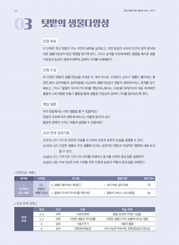 03 텃밭의 생물다양성 단원 목표 이 단원은 학교 텃밭이 주는 자연의 혜택을 살펴보고, 자연 환경의 규모와 인간의 경작 방식에 따른 생물다양성의 증감 영향을 탐구해 본다. 그리고 농작물 수분매개체인 꿀벌을 예시로 생물 다양성과 농경지 생태계 혜택의 경제적 가치를 이해해본다. 단원 구성 이 단원은 텃밭의 생물다양성을 주제로 두 개의 차시로 구성된다. 6차시 「생물이 좋아하는 환 경은」에서 상자텃밭과 실외텃밭을 비교하여 생물다양성과 텃밭의 생태계서비스 관계를 탐구 해보고, 7차시 「꿀벌이 우리의 먹거리를 책임져요」에서는 수분 꽃가루받이 의 대표 매개체인 꿀벌의 스토리텔링 만들기 활동을 통해 생물종 다양성의 경제적 가치를 알아보도록 한다. 핵심 질문 우리 텃밭에서는 어떤 생물을 볼 수 있을까요? 텃밭의 규모에 따...