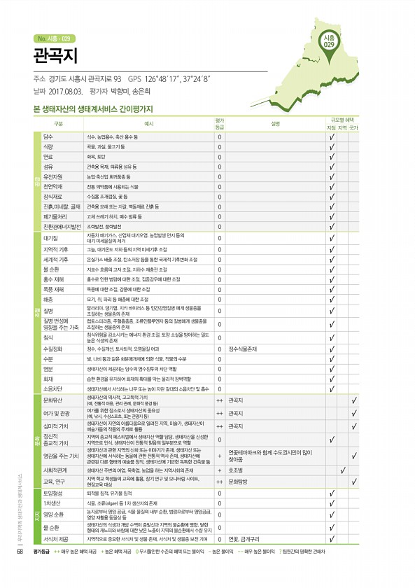 군산 001 No. 시흥 본 생태자산의 생태계서비스 간이평가지 구분 예시 평가 등급 설명 규모별 혜택 지점 지역 국가 공급 담수 식수, 농업용수, 축산 용수 등 0 √ 식량 곡물, 과실, 물고기 등 0 √ 연료 화목, 토탄 0 √ 섬유 건축용 목재, 의류용 섬유 등 0 √ 유전자원 농업·축산업 희귀품종 등 0 √ 천연약재 전통 의약품에 사용되는 식물 0 √ 장식재료 수집용 조개껍질, 꽃 등 0 √ 진흙,미네랄, 골재 건축용 모래 또는 자갈, 벽돌재료 진흙 등 0 √ 폐기물처리 고체 쓰레기 하치, 폐수 방류 등 0 √ 친환경에너지발전 조력발전, 풍력발전 0 √ 조절 대기질 자동차 배기가스, 산업체 대기오염, 농업발생 먼지 등의 대기 미세물질의 제거 0 √ 지역적 기후 그늘, 대기온도 저하 등의 지역 미세기후 ...