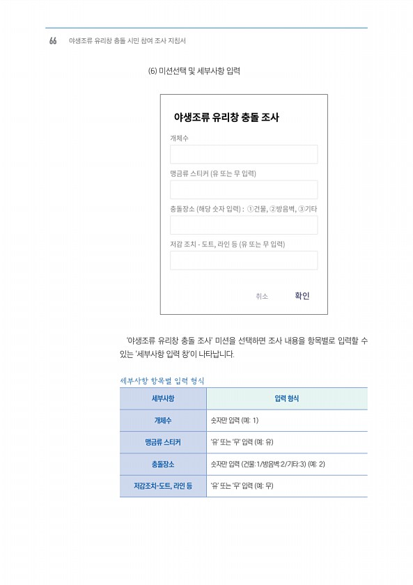 6 미션선택 및 세부사항 입력 ‘야생조류 유리창 충돌 조사’ 미션을 선택하면 조사 내용을 항목별로 입력할 수 있는 ‘세부사항 입력 창’이 나타납니다. 세부사항 항목별 입력 형식 세부사항 입력 형식 개체수 숫자만 입력 예1 맹금류 스티커 ‘유’ 또는 ‘무’ 입력 예유 충돌장소 숫자만 입력 건물1/방음벽2/기타3 예2 저감조치-도트, 라인 등 ‘유’ 또는 ‘무’ 입력 예무 66 야생조류 유리창 충돌 시민 참여 조사지침서