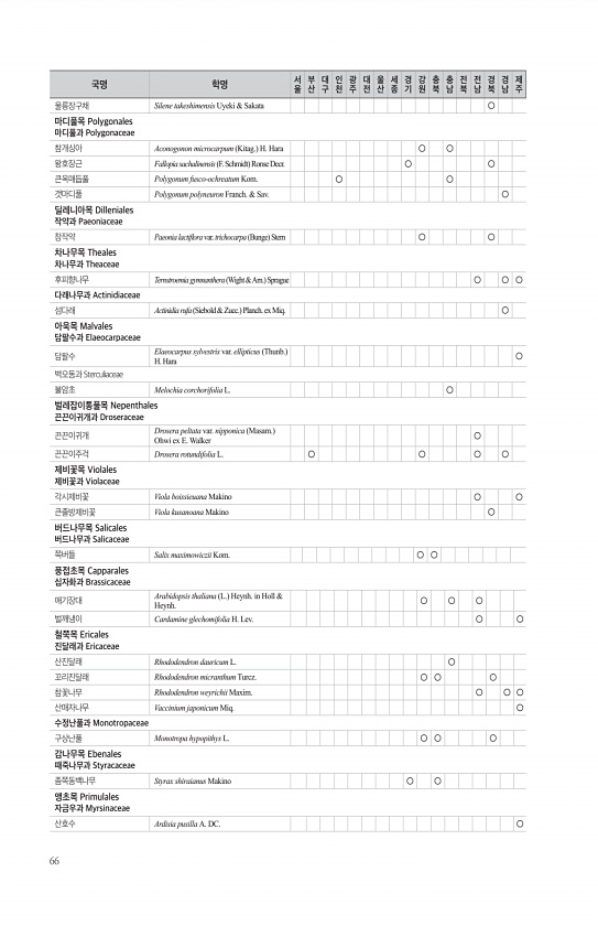 66 울릉장구채 Silene takeshimensis Uyeki & Sakata ○ 마디풀목 Polygonales 마디풀과 Polygonaceae 참개싱아 Aconogonon microcarpum Kitag. H. Hara ○ ○ 왕호장근 Fallopia sachalinensis F. Schmidt Ronse Decr. ○ ○ 큰옥매듭풀 Polygonum fusco-ochreatum Kom. ○ ○ 갯마디풀 Polygonum polyneuron Franch. & Sav. ○ 딜레니아목 Dilleniales 작약과 Paeoniaceae 참작약 Paeonia lactifora var. trichocarpa Bunge Stern ○ ○ 차나무목 Theales 차나무과 Theaceae 후피향나무 Ternstroem...