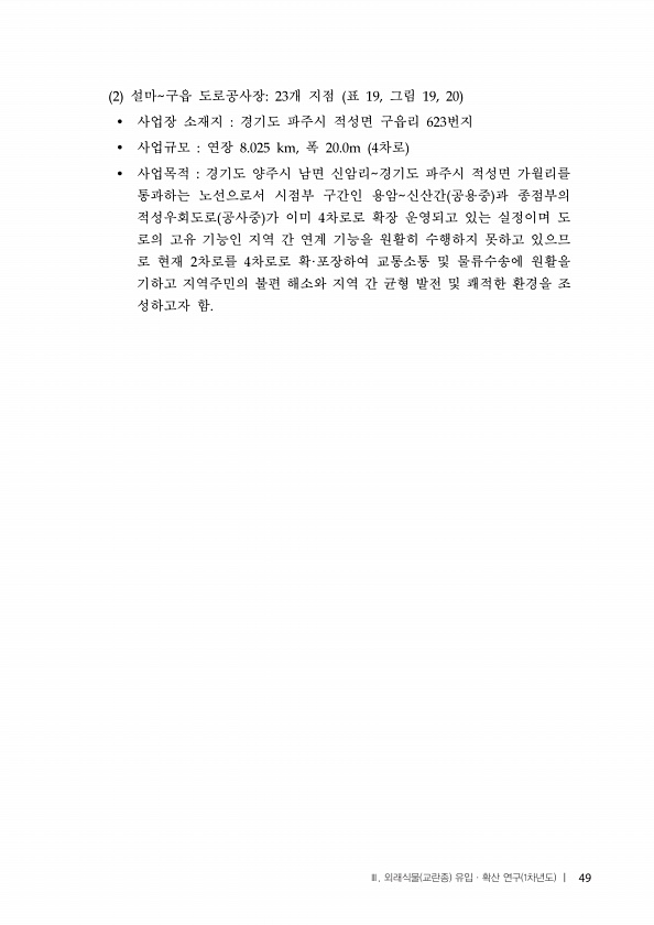 설마 구읍 도로공사장 개 지점 표 그림 ? 사업장 소재지 경기도 파주시 적성면 구읍리 번지 ? 사업규모 연장 폭 차로 ? 사업목적 경기도 양주시 남면 신암리 경기도 파주시 적성면 가월리를 통과하는 노선으로서 시점부 구간인 용암 신산간 공용중 과 종점부의 적성우회도로 공사중 가 이미 차로로 확장 운영되고 있는 실정이며 도 로의 고유 기능인 지역 간 연계 기능을 원활히 수행하지 못하고 있으므 로 현재 차로를 차로로 확 포장하여 교통소통 및 물류수송에 원활을 기하고 지역주민의 불편 해소와 지역 간 균형 발전 및 쾌적한 환경을 조 성하고자 함 Ⅲ. 외래식물 교란종 유입·확산 연구 1차년도 |49