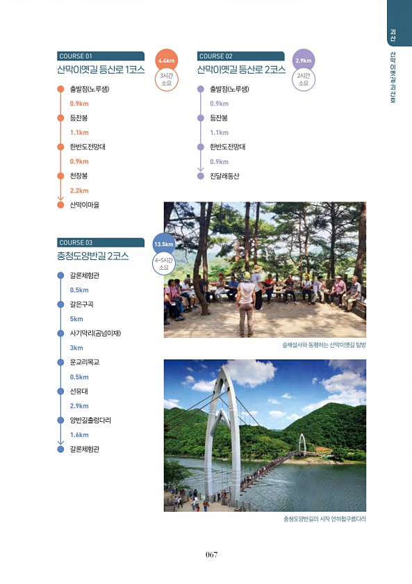 067 괴산 산 산 산 산 산 산산 산 산 산막이옛길 등산로 1코스 COURSE 01 출발점 노루샘 0.9km 등잔봉 1.1km 한반도전망대 0.9km 천장봉 2.2km 산막이마을 충청도양반길 2코스 COURSE 03 갈론체험관 0.5km 갈은구곡 5km 사기막리 곰넘이재 3km 운교리목교 양반길출렁다리 갈론체험관 0.5km 2.9km 1.6km 선유대 산막이옛길 등산로 2코스 COURSE 02 출발점 노루샘 0.9km 등잔봉 1.1km 한반도전망대 0.9km 진달래동산 숲해설사와 동행하는 산막이옛길 탐방 충청도양반길의 시작 연하협구름다리 2.9km 2시간 소요 4.4km 3시간 소요 13.5km 45시간소요