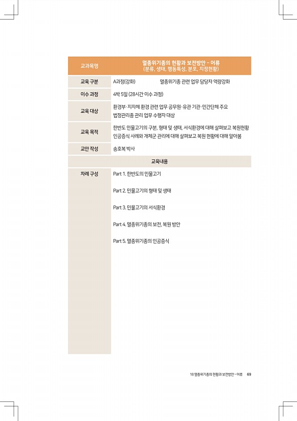 18 멸종위기종의 현황과 보전방안 ? 어류 69 교과목명 멸종위기종의 현황과 보전방안 ? 어류 분류, 생태, 행동특성, 분포, 지정현황 교육 구분 A과정 강화 멸종위기종 관련 업무 담당자 역량강화 이수 과정 4박 5일 28시간 이수 과정 교육 대상 환경부·지자체 환경 관련 업무 공무원·유관 기관·민간단체 주요 법정관리종 관리 업무 수행자 대상 교육 목적 한반도 민물고기의 구분, 형태 및 생태, 서식환경에 대해 살펴보고 복원현황 인공증식 사례와 개체군 관리에 대해 살펴보고 복원 현황에 대해 알아봄 교안 작성 송호복 박사 교육내용 차례 구성 Part 1. 한반도의 민물고기 Part 2. 민물고기의 형태 및 생태 Part 3. 민물고기의 서식환경 Part 4. 멸종위기종의 보전, 복원 방안 Part 5. 멸종위기...