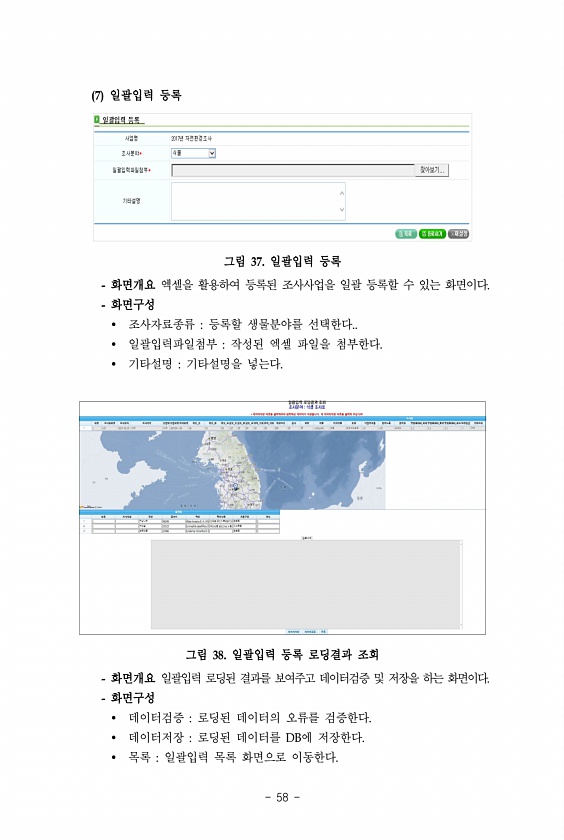 58 7 일괄입력 등록 그림 37. 일괄입력 등록 화면개요 엑셀을 활용하여 등록된 조사사업을 일괄 등록할 수 있는 화면이다. 화면구성 ? 조사자료종류 등록할 생물분야를 선택한다.. ? 일괄입력파일첨부 작성된 엑셀 파일을 첨부한다. ? 기타설명 기타설명을 넣는다. 그림 38. 일괄입력 등록 로딩결과 조회 화면개요 일괄입력 로딩된 결과를 보여주고 데이터검증 및 저장을 하는 화면이다. 화면구성 ? 데이터검증 로딩된 데이터의 오류를 검증한다. ? 데이터저장 로딩된 데이터를 DB에 저장한다. ? 목록 일괄입력 목록 화면으로이동한다.
