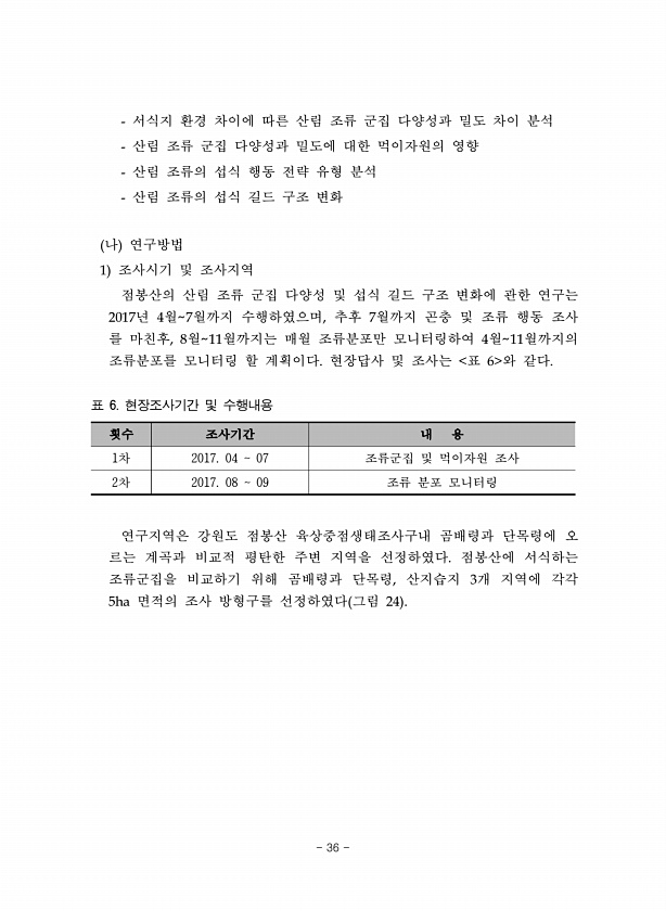 서식지 환경 차이에 따른 산림 조류 군집 다양성과 밀도 차이 분석 산림 조류 군집 다양성과 밀도에 대한 먹이자원의 영향 산림 조류의 섭식 행동 전략 유형 분석 산림 조류의 섭식 길드 구조 변화 나 연구방법 1 조사시기 및 조사지역 점봉산의 산림 조류 군집 다양성 및 섭식 길드 구조 변화에 관한 연구는 2017년 4월7월까지 수행하였으며, 추후 7월까지 곤충 및 조류 행동 조사 를 마친후, 8월11월까지는 매월 조류분포만 모니터링하여 4월11월까지의 조류분포를 모니터링 할 계획이다. 현장답사 및 조사는 표 6 와 같다. 횟수 조사기간 내 용 1차 2017. 04 07 조류군집 및 먹이자원 조사 2차 2017. 08 09 조류 분포 모니터링 표 6. 현장조사기간 및 수행내용 연구지역은 강원도 점봉산 육상중점생태...