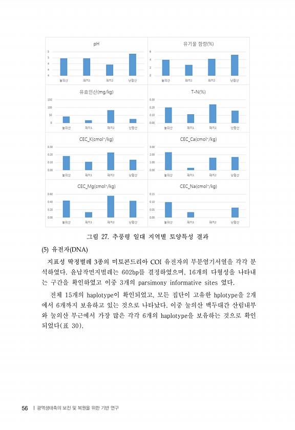 56 그림 27. 추풍령 일대 지역별 토양특성 결과 유전자 지표성 딱정벌레 종의 미토콘드리아 I 유전자의 부분염기서열을 각각 분 석하였다. 윤납작먼지벌레는 602bp를 결정하였으며, 16개의 다형성을 나타내 는 구간을 확인하였고 이중 3개의 parsimony informative sites 였다. 전체 15개의 haplotype이 확인되었고, 모든 집단이 고유한 hplotype을 2개 에서 6개까지 보유하고 있는 것으로 나타났다. 이중 눌의산 백두대간 산림내부 와 눌의산 부근에서 가장 많은 각각 6개의 haplotype을 보유하는 것으로 확인 되었다 표 30 56 | 광역생태축의 보전 및 복원을 위한 기반연구