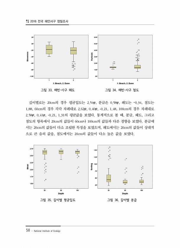 2016 전국 해안사구 정밀조사 58 ? National Institute of Ecology 그림 33. 해빈-사구 왜도 그림 34. 해빈-사구 첨도 깊이별로는 20cm의 경우 평균입도는 2.54φ, 분급은 0.58φ, 왜도는 ?0.34, 첨도는 1.88, 60cm의 경우 각각 차례대로 2.62φ, 0.40φ, -0.21, 1.48, 100cm의 경우 차례대로 2.58φ, 0.41φ, -0.21, 1.31의 평균값을 보였다. 통계적으로 볼 때, 분급, 왜도, 그리고 첨도의 항목에서 20cm의 값들이 60cm나 100cm의 값들과 다른 경향을 보였다. 분급에 서는 20cm의 값들이 다소 조립한 특징을 보였으며, 왜도에서는 20cm의 값들이 상대적 으로 큰 음의 값을, 첨도에서는 20cm의 값들이 다소 높은 ...