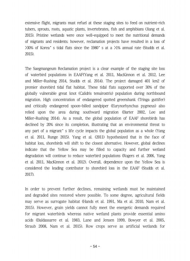 54 extensive flight, migrants must refuel at these staging sites to feed on nutrient-rich tubers, sprouts, roots, aquatic plants, invertebrates, fish and amphibians Jiang et al. 2015 Pristine wetlands were once well-equipped to meet the nutritional demands of migrants and residents; however, reclamation projects have resulted in a loss of 30% of Korea’s tidal flats since the 1980’s at a 1% annual ...