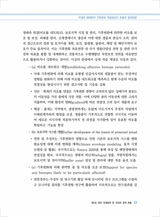 국내외 생태분야 기후변화 적응방안의 흐름과 발전방향 제2장 관련 국제협약 및 국내외 정책 현황 53 생태축 연결 비오톱 네트워크 , 보호지역 지정 및 관리, 기후변화에 취약한 비오톱 보 호 및 보전, 외래종 관리, 신재생에너지 생산과 이에 대한 생물적 관심사 고려, 관리 적 접근으로의 경관 및 토지이용 계획, 보건, 물평형, 물관리, 해양 및 해안지역의 보 호가 주요 골자이다. 이는 기후변화 적응전략 내 국가 생물다양성 전략 등 관련 국가 전략 목표를 통합 및 내재화하고 전통적으로 수행해왔던 자연보전 전략을 적응방안 으로 활용하거나 강화하는 것이다. 이상의 관점에서 상세 적응 개념은 다음과 같다. a 비오톱 네트워크 개발 establishing effective biotope networks ? 미래 기후변...