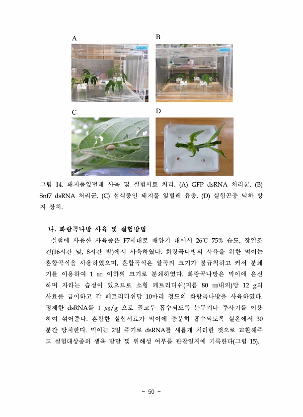 그림 14. 돼지풀잎벌레 사육 및 실험시료 처리. A GFP dsRNA 처리군. B Snf7 dsRNA 처리군. C 섭식중인 돼지풀 잎벌레 유충. D 실험곤충 낙하 방 지 장치. 나. 화랑곡나방 사육 및 실험방법 실험에 사용한 사육종은 F7세대로 배양기 내에서 26℃ 75% 습도, 장일조 건 16시간 낮, 8시간 밤 에서 사육하였다. 화랑곡나방의 사육을 위한 먹이는 혼합곡식을 사용하였으며, 혼합곡식은 알곡의 크기가 불규칙하고 커서 분쇄 기를 이용하여 1 ㎜ 이하의 크기로 분쇄하였다. 화랑곡나방은 먹이에 은신 하며 자라는 습성이 있으므로 소형 페트리디쉬 지름 80 ㎜내외 당 12 g의 사료를 급이하고 각 페트리디쉬당 10마리 정도의 화랑곡나방을 사육하였다. 정제한 dsRNA를 1 ㎍/g 으로 골고루 흡수되도록...