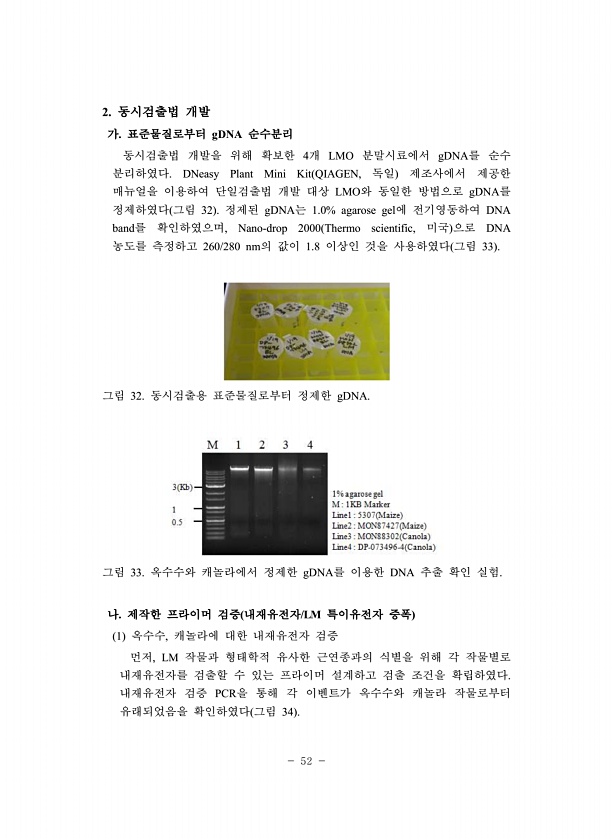 52 2. 동시검출법 개발 가. 표준물질로부터 gDNA 순수분리 동시검출법 개발을 위해 확보한 4개 LMO 분말시료에서 gDNA를 순수 분리하였다. DNeasy Plant Mini Kit QIAGEN, 독일 제조사에서 제공한 매뉴얼을 이용하여 단일검출법 개발 대상 LMO와 동일한 방법으로 gDNA를 정제하였다 그림 32 정제된 gDNA는 1.0% agarose gel에 전기영동하여 DNA band를 확인하였으며, Nano-drop 2000 Thermo scientific, 미국 으로 DNA 농도를 측정하고 260/280 nm의 값이 1.8 이상인 것을 사용하였다 그림 33 그림 32. 동시검출용 표준물질로부터 정제한 gDNA. 그림 33. 옥수수와 캐놀라에서 정제한 gDNA를 이용한 DNA 추출 확인 실험....