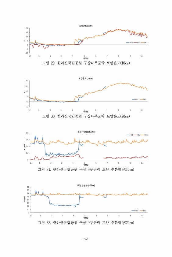그림 29. 한라산국립공원 구상나무군락 토양온도 10㎝ 그림 30. 한라산국립공원 구상나무군락 토양온도 20㎝ 그림 31. 한라산국립공원 구상나무군락 토양 수분함량 10㎝ 그림 32. 한라산국립공원 구상나무군락 토양 수분함량 20㎝ 52