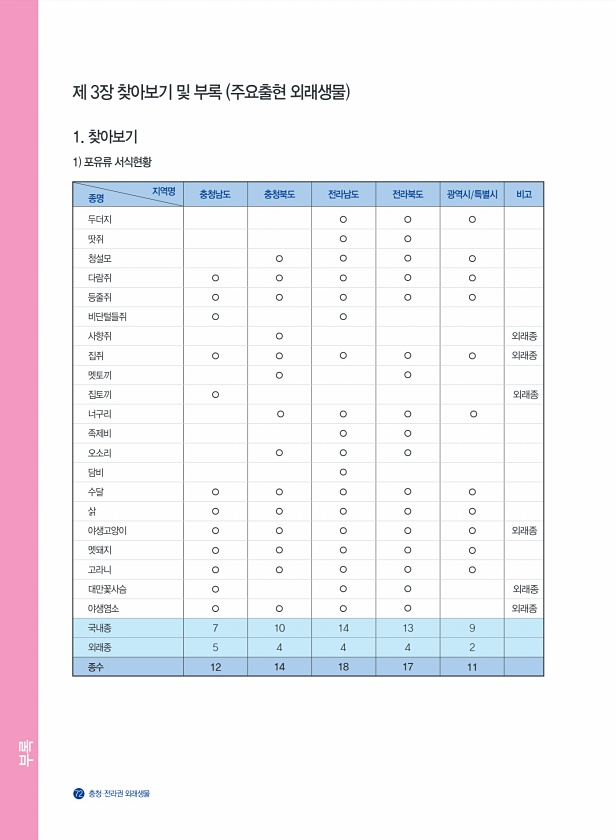 부록 72 충청?전라권 외래생물 제 3장 찾아보기 및 부록 주요출현 외래생물 1. 찾아보기 1 포유류 서식현황 두더지 땃쥐 청설모 다람쥐 등줄쥐 비단털들쥐 사향쥐 집쥐 멧토끼 집토끼 너구리 족제비 오소리 담비 수달 삵 야생고양이 멧돼지 고라니 대만꽃사슴 야생염소 국내종 외래종 종수 ○ ○ ○ ○ ○ ○ ○ ○ ○ ○ ○ ○ 7 5 12 ○ ○ ○ ○ ○ ○ ○ ○ ○ ○ ○ ○ ○ ○ 10 4 14 ○ ○ ○ ○ ○ ○ ○ ○ ○ ○ ○ ○ ○ ○ ○ ○ ○ ○ 14 4 18 ○ ○ ○ ○ ○ ○ ○ ○ ○ ○ ○ ○ ○ ○ ○ ○ ○ 13 4 17 종명 지역명 충청남도 충청북도 전라남도 전라북도 광역시/특별시 비고 ○ ○ ○ ○ ○ ○ ○ ○ ○ ○ ○ 9 2 11 외래종 외래종 외래종 외래종 외래종외래종