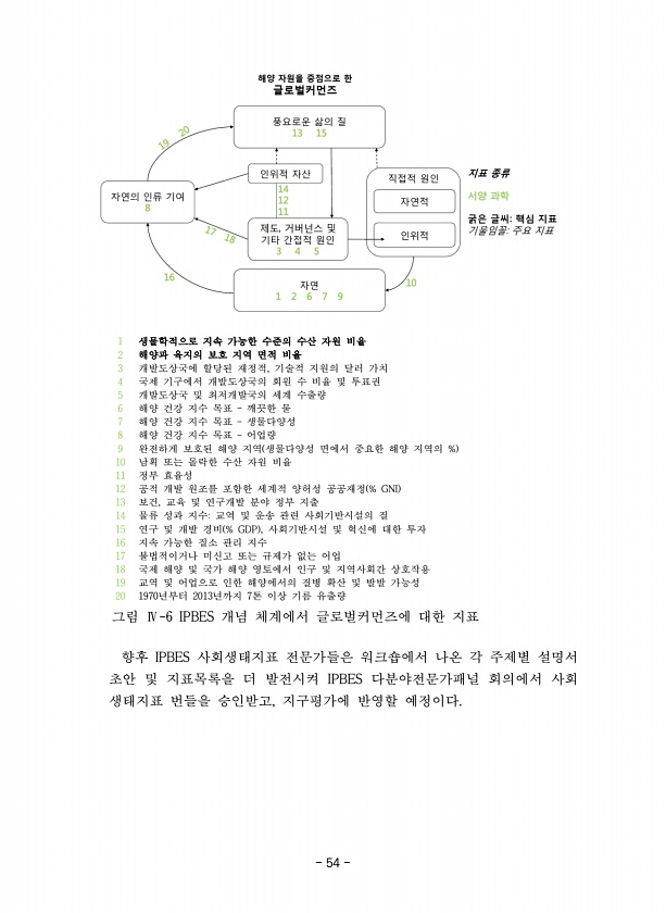 54 1 생물학적으로 지속 가능한 수준의 수산 자원 비율 2 해양과 육지의 보호 지역 면적 비율 3 개발도상국에 할당된 재정적, 기술적 지원의 달러 가치 4 국제 기구에서 개발도상국의 회원 수 비율 및 투표권 5 개발도상국 및 최저개발국의 세계 수출량 6 해양 건강 지수 목표 ? 깨끗한 물 7 해양 건강 지수 목표 ? 생물다양성 8 해양 건강 지수 목표 ? 어업량 9 완전하게 보호된 해양 지역 생물다양성 면에서 중요한 해양 지역의 % 10 남획 또는 몰락한 수산 자원 비율 11 정부 효율성 12 공적 개발 원조를 포함한 세계적 양허성 공공재정 % GNI 13 보건, 교육 및 연구개발 분야 정부 지출 14 물류 성과 지수교역 및 운송 관련 사회기반시설의 질 15 연구 및 개발 경비 % GDP , 사회기반시설 ...