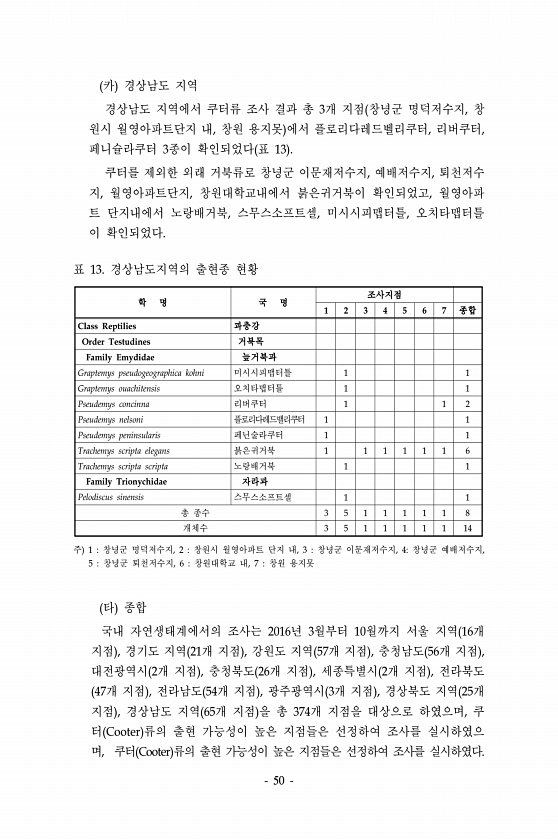 50 카 경상남도 지역 경상남도 지역에서 쿠터류 조사 결과 총 3개 지점 창녕군 명덕저수지, 창 원시 월영아파트단지 내, 창원 용지못 에서 플로리다레드벨리쿠터, 리버쿠터, 페니슐라쿠터 3종이 확인되었다 표 13 쿠터를 제외한 외래 거북류로 창녕군 이문재저수지, 예배저수지, 퇴천저수 지, 월영아파트단지, 창원대학교내에서 붉은귀거북이 확인되었고, 월영아파 트 단지내에서 노랑배거북, 스무스소프트셀, 미시시피맵터틀, 오치타맵터틀 이 확인되었다. 표 13. 경상남도지역의 출현종 현황 학 명 국 명 조사지점 1 2 3 4 5 6 7 종합 Class Reptilies 파충강 Order Testudines 거북목 Family Emydidae 늪거북과 Graptemys pseudogeographica kohni 미시시피맵터...