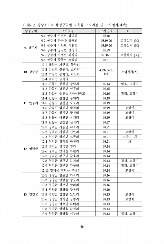 표 Ⅲ- 2. 경상북도의 행정구역별 포유류 조사지점 및 조사일자 계속 행정구역 조사지점 조사일자 비고 9. 상주시 9-1 상주시 사벌면 삼덕리 05.18 9-2 상주시 함창읍 금곡리 05.19-20 트렙설치 30 9-3 상주시 이안면 이안리 05.19-20 트렙설치 30 9-4 상주시 공검면 양정리 05.29 9-5 상주시 사벌면 퇴강리 05.30-31 트렙설치 30 9-6 상주시 중동면 오상리 05.31 10. 성주군 10-1 용암면 기산리, 동락리 4.29-05.01, 10-2 10-3 선남면 선원리 벽진면 봉학리,, 소학리 자산리 8.6. 트랩설치 20 10-4 대가면 금곡리 11. 안동시 11-1 안동시 풍천면 광덕리 06.14 염소, 고양이 11-2 안동시 남선면 신흥리 06.15 11-3 안동시 ...
