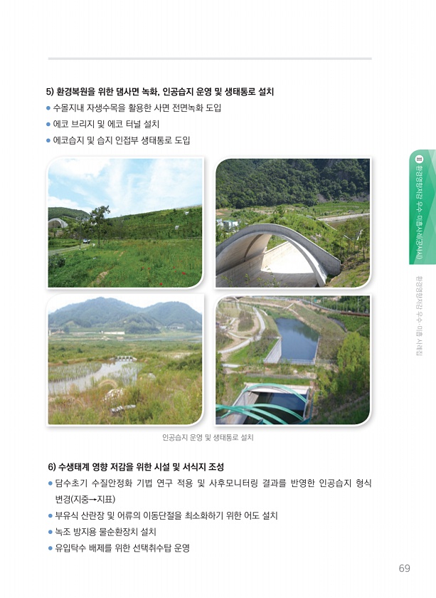 69 환경영향저감 우수·미흡사례 공사시 환경영향저감 우수·미흡 사례집 인공습지 운영 및 생태통로 설치 5 환경복원을 위한 댐사면 녹화, 인공습지 운영 및 생태통로 설치 ● 수몰지내 자생수목을 활용한 사면 전면녹화 도입 ● 에코 브리지 및 에코 터널 설치 ● 에코습지 및 습지 인접부 생태통로 도입 6 수생태계 영향 저감을 위한 시설 및 서식지 조성 ● 담수초기 수질안정화 기법 연구 적용 및 사후모니터링 결과를 반영한 인공습지 형식 변경 지중→지표 ● 부유식 산란장 및 어류의 이동단절을 최소화하기 위한 어도 설치 ● 녹조 방지용 물순환장치 설치 ● 유입탁수 배제를 위한 선택취수탑운영