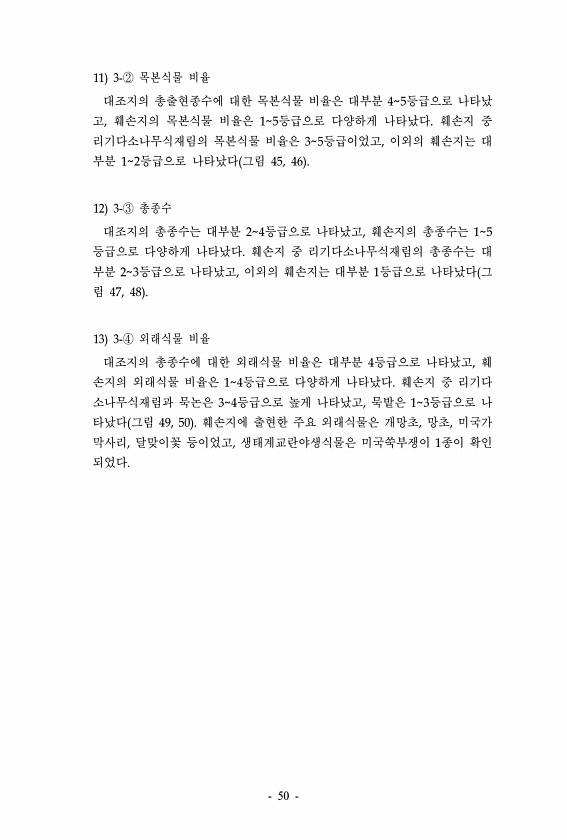 11 3-② 목본식물 비율 대조지의 총출현종수에 대한 목본식물 비율은 대부분 45등급으로 나타났 고, 훼손지의 목본식물 비율은 15등급으로 다양하게 나타났다. 훼손지 중 리기다소나무식재림의 목본식물 비율은 35등급이었고, 이외의 훼손지는 대 부분 12등급으로 나타났다 그림 45, 46 12 3-③ 총종수 대조지의 총종수는 대부분 24등급으로 나타났고, 훼손지의 총종수는 15 등급으로 다양하게 나타났다. 훼손지 중 리기다소나무식재림의 총종수는 대 부분 23등급으로 나타났고, 이외의 훼손지는 대부분 1등급으로 나타났다 그 림 47, 48 13 3-④ 외래식물 비율 대조지의 총종수에 대한 외래식물 비율은 대부분 4등급으로 나타났고, 훼 손지의 외래식물 비율은 14등급으로 다양하게 나타났다. 훼손지 중 리기다 소나...