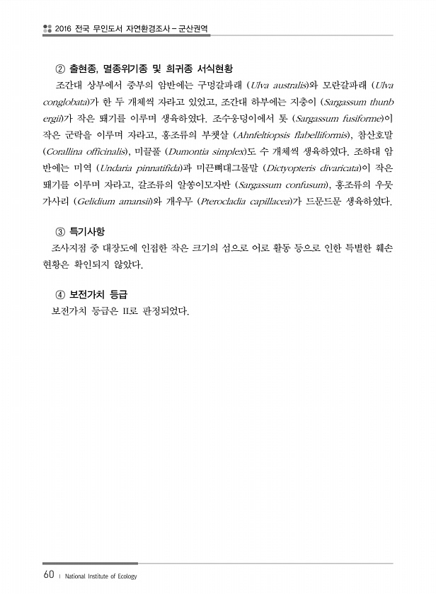2016 전국 무인도서 자연환경조사 군산권역 60 ? National Institute of Ecology ② 출현종, 멸종위기종 및 희귀종 서식현황 조간대 상부에서 중부의 암반에는 구멍갈파래 Ulva australis 와 모란갈파래 Ulva conglobata 가 한 두 개체씩 자라고 있었고, 조간대 하부에는 지충이 Sargassum thunb ergii 가 작은 뙈기를 이루며 생육하였다. 조수웅덩이에서 톳 Sargassum fusiforme 이 작은 군락을 이루며 자라고, 홍조류의 부챗살 Ahnfeltiopsis flabelliformis , 참산호말 Corallina officinalis , 미끌풀 Dumontia simplex 도 수 개체씩 생육하였다. 조하대 암 반에는 미역 Undaria pinna...