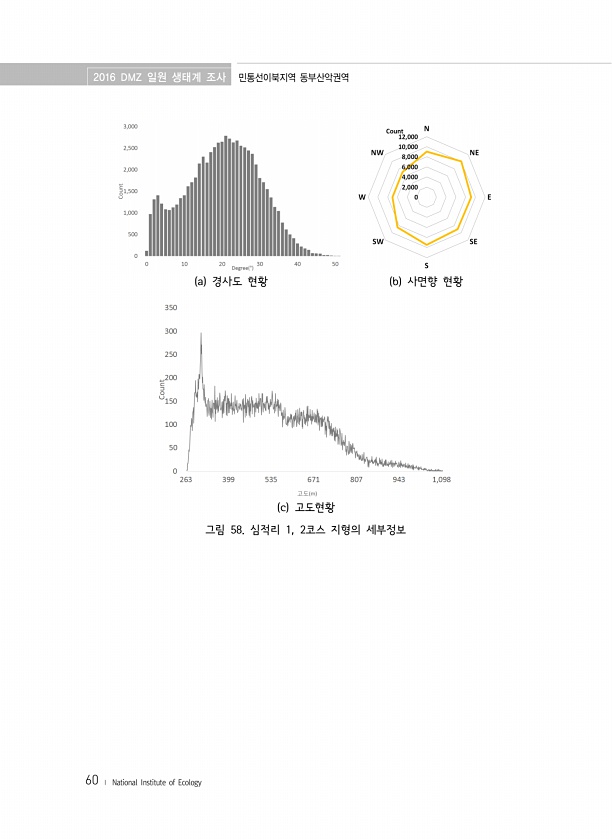 2016 DMZ 일원 생태계 조사 민통선이북지역 동부산악권역 60 ? National Institute of Ecology a 경사도 현황 b 사면향 현황 c 고도현황 그림 58. 심적리 1, 2코스 지형의세부정보