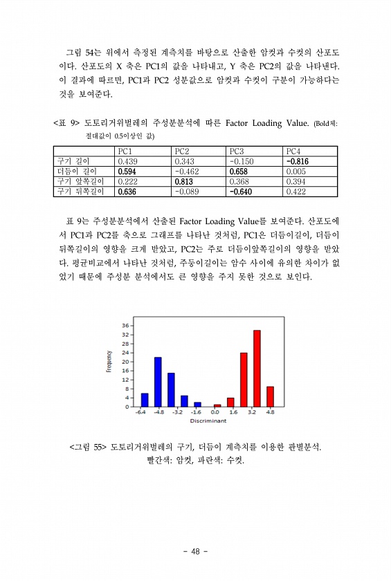 48 그림 54는 위에서 측정된 계측치를 바탕으로 산출한 암컷과 수컷의 산포도 이다. 산포도의 X 축은 PC1의 값을 나타내고, Y 축은 PC2의 값을 나타낸다. 이 결과에 따르면, PC1과 PC2 성분값으로 암컷과 수컷이 구분이 가능하다는 것을 보여준다. PC1 PC2 PC3 PC4 구기 길이 0.439 0.343 -0.150 -0.816 더듬이 길이 0.594 -0.462 0.658 0.005 구기 앞쪽길이 0.222 0.813 0.368 0.394 구기 뒤쪽길이 0.636 -0.089 -0.640 0.422 표 9 도토리거위벌레의 주성분분석에 따른 Factor Loading Value. Bold체절대값이 0.5이상인 값 표 9는 주성분분석에서 산출된 Factor Loading Value를 보여준다. 산...