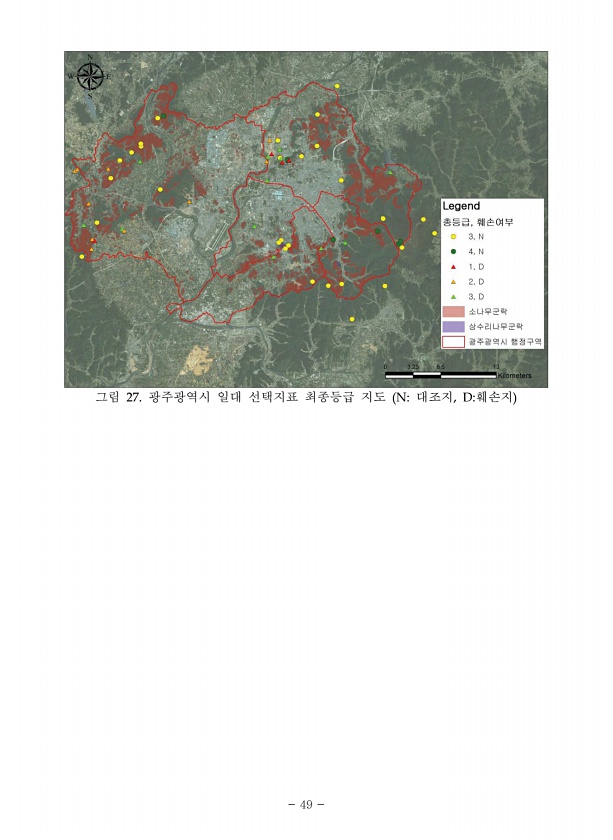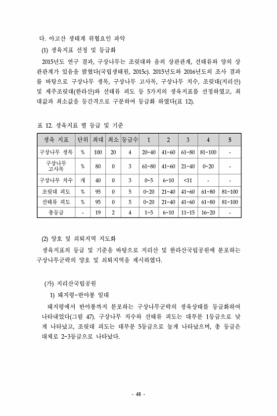 48 다. 아고산 생태계 위협요인 파악 1 생육지표 선정 및 등급화 2015년도 연구 결과, 구상나무는 조릿대와 음의 상관관계, 선태류와 양의 상 관관계가 있음을 밝혔다 국립생태원, 2015c 2015년도와 2016년도의 조사 결과 를 바탕으로 구상나무 생목, 구상나무 고사목, 구상나무 치수, 조릿대 지리산 및 제주조릿대 한라산 와 선태류 피도 등 5가지의 생육지표를 선정하였고, 최 대값과 최소값을 등간격으로 구분하여 등급화 하였다 표 12 생육 지표 단위 최대 최소 등급수 1 2 3 4 5 구상나무 생목 % 100 20 4 2040 4160 6180 81100 구상나무 고사목 % 80 0 3 6180 4160 2140 020 구상나무 치수 개 40 0 3 05 610 11 조릿대 피도 % 95 0 5 02...
