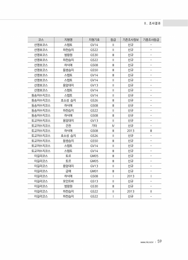 Ⅱ. 조사결과 www.nie.re.kr ? 59 코스 지형명 지형기호 등급 기존조사정보 기종조사등급 산명호코스 스텝토 GV14 Ⅱ 신규 산명호코스 하천습지 GS22 Ⅱ 신규 산명호코스 범람원 GS30 Ⅲ 신규 산명호코스 하천습지 GS22 Ⅱ 신규 산명호코스 하식애 GS08 Ⅲ 신규 산명호코스 둠벙습지 GS50 Ⅲ 신규 산명호코스 스텝토 GV14 Ⅲ 신규 산명호코스 스텝토 GV14 Ⅱ 신규 산명호코스 용암대지 GV13 Ⅱ 신규 산명호코스 스텝토 GV14 Ⅱ 신규 동송저수지코스 스텝토 GV14 Ⅱ 신규 동송저수지코스 호소성 습지 GS26 Ⅲ 신규 동송저수지코스 하식애 GS08 Ⅲ 신규 동송저수지코스 하천습지 GS22 Ⅱ 신규 동송저수지코스 하식애 GS08 Ⅲ 신규 토교저수지코스 용암대지 GV13 Ⅱ 신규 토교저...