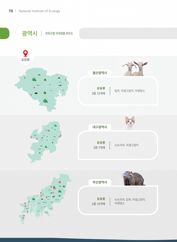 광역시 분류군별 외래생물 분포도 동구 북구 서구 중구 달서구 남구 달성군 달성군 수성구 울주군 중구 북구 남구 동구 포유류 포유류 3종 12개체 포유류 4종 15개체 포유류 2종 7개체 집쥐, 야생고양이, 야생염소 뉴트리아, 집쥐, 야생고양이, 야생염소 뉴트리아, 야생고양이 기장군 금정구 해운대구 동래구 북구 강서구 사상구 부산진구 남구 수영구 연제구 동구 서구 영도구 사하구 울산광역시 대구광역시 부산광역시 70 National Institute ofEcology