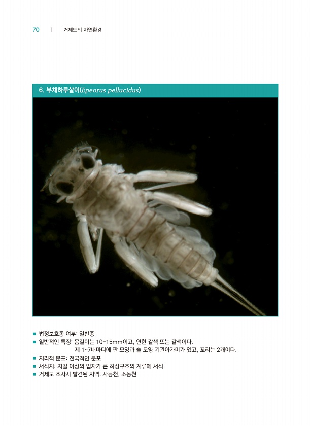 70 ┃ 거제도의 자연환경 6. 부채하루살이 Epeorus pellucidus ■ 법정보호종 여부일반종 ■ 일반적인 특징몸길이는 10-15mm이고, 연한 갈색 또는 갈색이다. 제 17배마디에 판 모양과 술 모양 기관아가미가 있고, 꼬리는 2개이다. ■ 지리적 분포전국적인 분포 ■ 서식지자갈 이상의 입자가 큰 하상구조의 계류에 서식 ■ 거제도 조사시 발견된 지역사등천,소동천