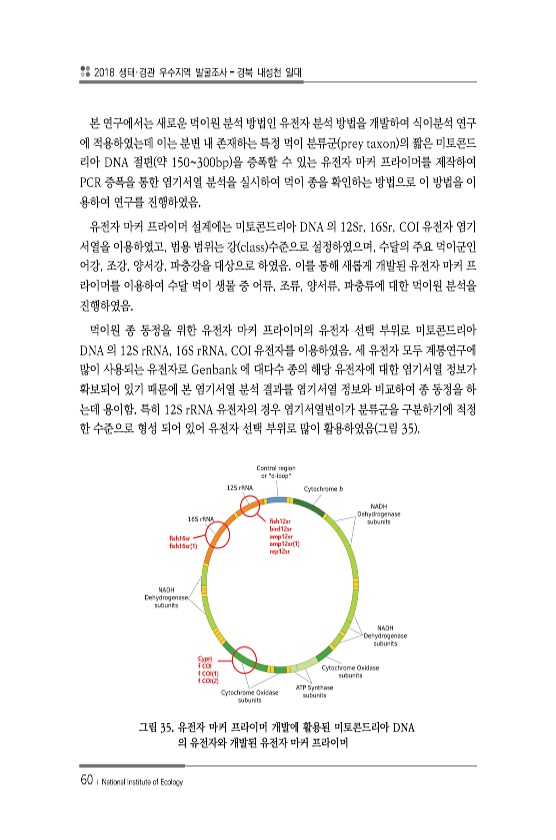 2018 생태·경관 우수지역 발굴조사 경북 내성천 일대 60 ? National Institute of Ecology 본 연구에서는 새로운 먹이원 분석 방법인 유전자 분석 방법을 개발하여 식이분석 연구 에 적용하였는데 이는 분변 내 존재하는 특정 먹이 분류군 prey taxon 의 짧은 미토콘드 리아 DNA 절편 약 150300bp 을 증폭할 수 있는 유전자 마커 프라이머를 제작하여 PCR 증폭을 통한 염기서열 분석을 실시하여 먹이 종을 확인하는 방법으로 이 방법을 이 용하여 연구를 진행하였음. 유전자 마커 프라이머 설계에는 미토콘드리아 DNA 의 12Sr, 16Sr, COI 유전자 염기 서열을 이용하였고, 범용 범위는 강 class 수준으로 설정하였으며, 수달의 주요 먹이군인 어강, 조강, 양서강, 파충강...
