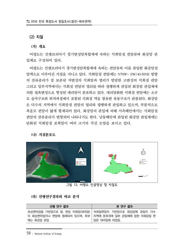 2016 전국 특정도서 정밀조사 옹진-북부권역 58 ? National Institute of Ecology 2 지질 가 개요 어평도는 선캠브리아기 경기변성암복합체에 속하는 석회암질 편암류와 화강암 관 입체로 구성되어 있다. 어평도는 선캠브리아기 경기변성암복합체에 속하는 편암류와 이를 관입한 화강암질 암맥으로 이루어진 지질을 지니고 있다. 석회암질 편암에는 N70WEW/40-50NE 방향 의 잔류층리가 잘 보존된 저변성의 석회암과 엽리가 발달한 고변성의 석회질 편암 그리고 일부지역에서는 석회질 편암의 엽리를 따라 평행하게 관입된 화강암 관입체에 의한 접촉변성으로 형성된 대리암이 분포하고 있다. 대리암화한 석회질 편암에는 소규 모 습곡구조와 퇴적과정에서 포함된 석회질 역을 함유한 유동구조가 관찰된다. 화강암 ...