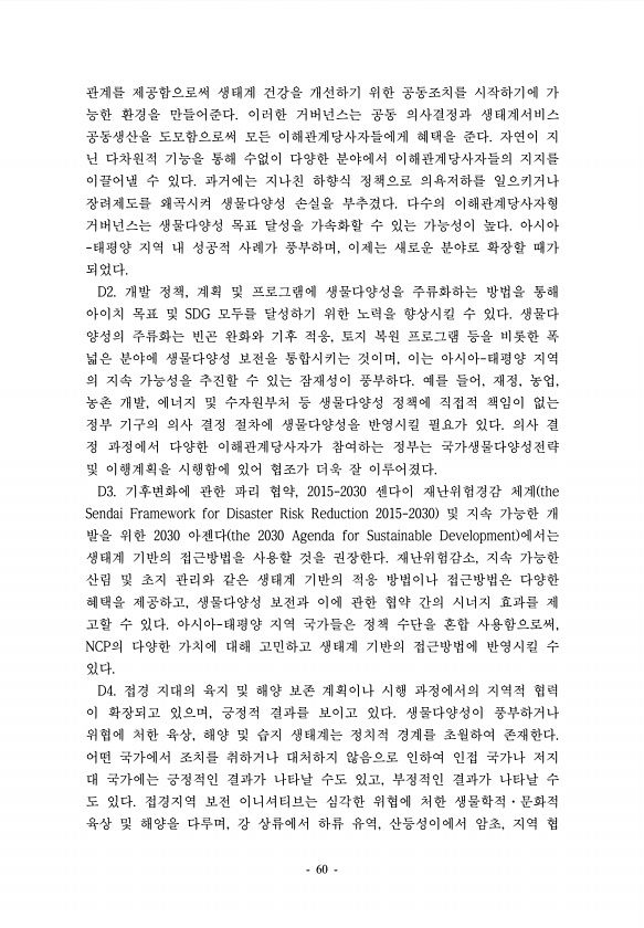 관계를 제공함으로써 생태계 건강을 개선하기 위한 공동조치를 시작하기에 가 능한 환경을 만들어준다. 이러한 거버넌스는 공동 의사결정과 생태계서비스 공동생산을 도모함으로써 모든 이해관계당사자들에게 혜택을 준다. 자연이 지 닌 다차원적 기능을 통해 수없이 다양한 분야에서 이해관계당사자들의 지지를 이끌어낼 수 있다. 과거에는 지나친 하향식 정책으로 의욕저하를 일으키거나 장려제도를 왜곡시켜 생물다양성 손실을 부추겼다. 다수의 이해관계당사자형 거버넌스는 생물다양성 목표 달성을 가속화할 수 있는 가능성이 높다. 아시아 -태평양 지역 내 성공적 사례가 풍부하며, 이제는 새로운 분야로 확장할 때가 되었다. D2. 개발 정책, 계획 및 프로그램에 생물다양성을 주류화하는 방법을 통해 아이치 목표 및 SDG 모두를 달성하기 위한...