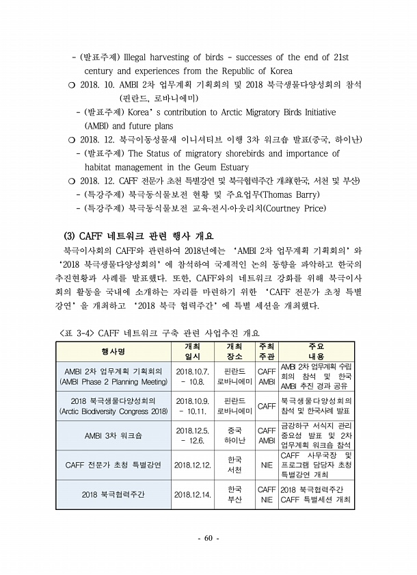 60 발표주제 Illegal harvesting of birds successes of the end of 21st century and experiences from the Republic of Korea ? 2018. 10. AMBI 2차 업무계획 기획회의 및 2018 북극생물다양성회의 참석 핀란드, 로바니에미 발표주제 Korea’s contribution to Arctic Migratory Birds Initiative AMBI and future plans ? 2018. 12. 북극이동성물새 이니셔티브 이행 3차 워크숍 발표 중국, 하이난 발표주제 The Status of migratory shorebirds and importance of habitat management in the Geum Es...