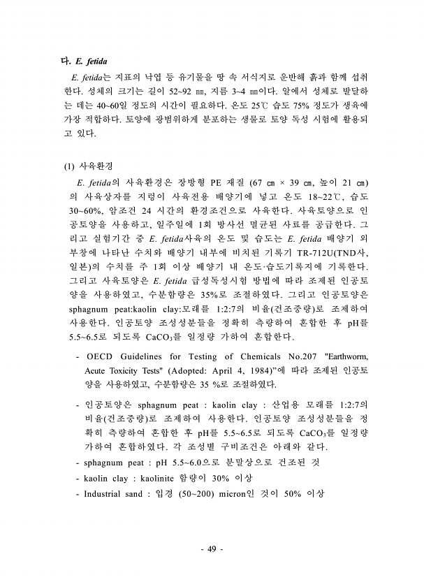49 다. E. fetida E. fetida는 지표의 낙엽 등 유기물을 땅 속 서식지로 운반해 흙과 함께 섭취 한다. 성체의 크기는 길이 5292 ㎜, 지름 34 ㎜이다. 알에서 성체로 발달하 는 데는 4060일 정도의 시간이 필요하다. 온도 25℃ 습도 75% 정도가 생육에 가장 적합하다. 토양에 광범위하게 분포하는 생물로 토양 독성 시험에 활용되 고 있다. 1 사육환경 E. fetida의 사육환경은 장방형 PE 재질 67 ㎝ × 39 ㎝, 높이 21 ㎝ 의 사육상자를 지렁이 사육전용 배양기에 넣고 온도 1822℃, 습도 3060%, 암조건 24 시간의 환경조건으로 사육한다. 사육토양으로 인 공토양을 사용하고, 일주일에 1회 방사선 멸균된 사료를 공급한다. 그 리고 실험기간 중 E. fetida사육의 온...