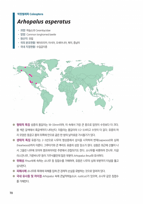 70 ● 형태적 특징 성충의 몸길이는 18-33mm이며, 이 속에서 가장 큰 종으로 암컷이 수컷보다 더 크다. 몸 색은 갈색에서 흑갈색까지 나타난다. 더듬이는 몸길이의 1/2-3/4이고 수컷이 더 길다. 유충의 머 리 모양은 둥글고 몸의 뒤쪽에 안으로 굽은 한 쌍의 날카로운 가시돌기가 있다. ● 생태적 특징 유충기는 2-3년으로 나무의 형성층에서 섭식을 시작하여 변재 sapwood 와 심재 heartwood 까지 이른다. 그루터기와 큰 뿌리도 유충의 성장 장소가 된다. 성충은 최근에 산불이 나 서 그을린 나무에 모이며 캠프파이어장 주변에서 관찰되기도 한다. 소나무를 비롯하여 전나무, 더글 러스전나무, 가문비나무 등이 기주식물인데 많은 부분이 Arhopalus ferus와 유사하다. ● 위해성 Pinus속에 ...