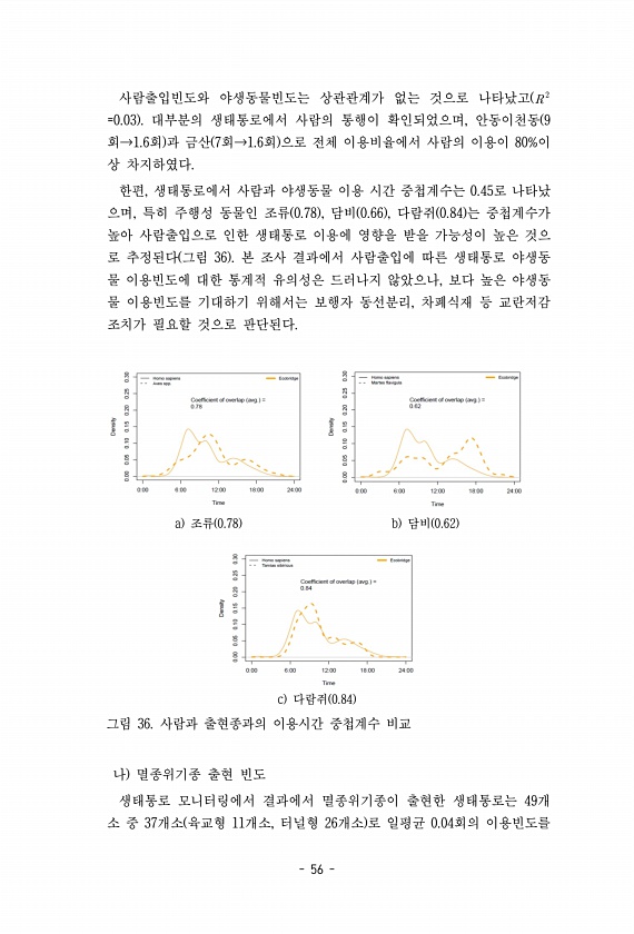 56 사람출입빈도와 야생동물빈도는 상관관계가 없는 것으로 나타났고 =0.03 대부분의 생태통로에서 사람의 통행이 확인되었으며, 안동이천동 9 회→1.6회 과 금산 7회→1.6회 으로 전체 이용비율에서 사람의 이용이 80%이 상 차지하였다. 한편, 생태통로에서 사람과 야생동물 이용 시간 중첩계수는 0.45로 나타났 으며, 특히 주행성 동물인 조류 0.78 , 담비 0.66 , 다람쥐 0.84 는 중첩계수가 높아 사람출입으로 인한 생태통로 이용에 영향을 받을 가능성이 높은 것으 로 추정된다 그림 36 본 조사 결과에서 사람출입에 따른 생태통로 야생동 물 이용빈도에 대한 통계적 유의성은 드러나지 않았으나, 보다 높은 야생동 물 이용빈도를 기대하기 위해서는 보행자 동선분리, 차폐식재 등 교란저감 조치가 필요...