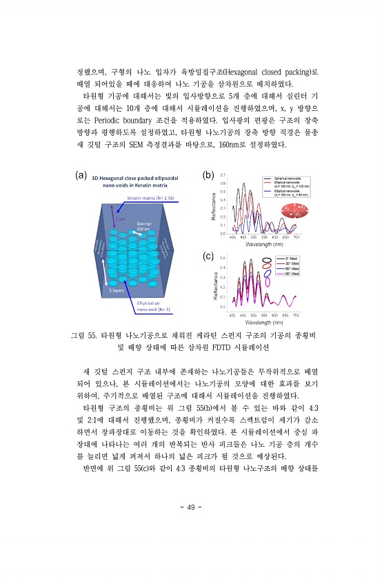49 정했으며, 구형의 나노 입자가 육방밀집구조 Hexagonal closed packing 로 배열 되어있을 때에 대응하여 나노 기공을 삼차원으로 배치하였다. 타원형 기공에 대해서는 빛의 입사방향으로 5개 층에 대해서 실린터 기 공에 대해서는 10개 층에 대해서 시뮬레이션을 진행하였으며, x, y 방향으 로는 Periodic boundary 조건을 적용하였다. 입사광의 편광은 구조의 장축 방향과 평행하도록 설정하였고, 타원형 나노기공의 장축 방향 직경은 물총 새 깃털 구조의 SEM 측정결과를 바탕으로, 160nm로 설정하였다. 그림 55. 타원형 나노기공으로 채워진 케라틴 스펀지 구조의 기공의 종횡비 및 배향 상태에 따른 삼차원 FDTD 시뮬레이션 새 깃털 스펀지 구조 내부에 존재하는 나노기공들은 무작위적...