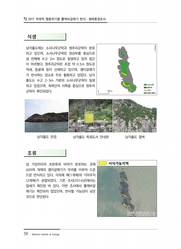 2017 국제적 멸종위기종 뿔제비갈매기 번식·생태환경조사 58 ? National Institute of Ecology 식생 낭각흘도에는 소사나무군락과 원추리군락이 분포 하고 있으며, 소사나무군락은 정상부를 중심으로 섬 전체에 수고 2m 정도로 밀생하고 있어 접근 이 어려웠다. 원추리군락은 초장 약 0.5m 정도로 억새, 둥굴레 등이 산재하고 있으며, 괭이갈매기 가 번식하는 장소로 주로 활용하고 있었다. 낭각 흘도는 수고 23m 가량의 소사나무군락이 밀생 하고 있었으며, 최북단의 서쪽을 중심으로 원추리 군락이 확인되었다. 낭각흘도 전경 낭각흘도 특정도서 안내판 낭각흘도 절벽 조류 섬 가장자리의 초본류와 바위가 분포하는 곳에 600여 개체의 괭이갈매기가 무리를 이루어 드문 드문 번식하고 있다. 이외에 매 1개...