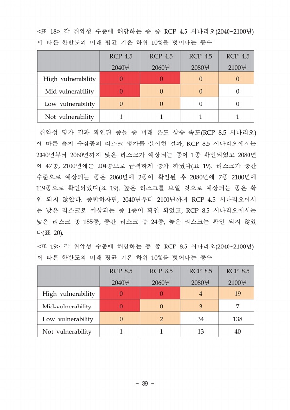 RCP 4.5 2040 RCP 4.5 2060 RCP 4.5 2080 RCP 4.5 2100 High vulnerability 0 0 0 0 Mid-vulnerability 0 0 0 0 Low vulnerability 0 0 0 0 Not vulnerability 1 1 1 1 18 RCP 4.5 ? 20402100 ? ? 10% ? RCP 8.5 ? , RCP 8.5 ? 2040 2060 ? ? 1 2080 47 , 2100 204 ? 19 2060 2 2080 7 2100 119 19 , 2040 2100 ?RCP 4.5 ? ? 1 , RCP 8.5 ? ? 185 , 24 , 20 RCP 8.5 2040 RCP 8.5 2060 RCP 8.5 2080 RCP 8.5 2100 High vulnerabili...