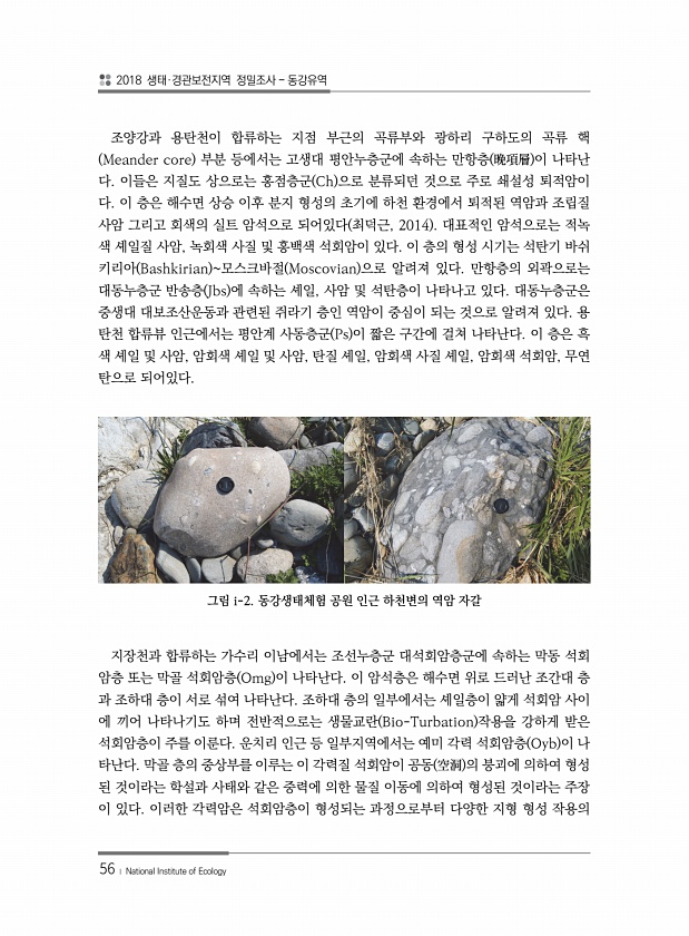 2018 생태·경관보전지역 정밀조사 동강유역 56 ? National Institute of Ecology 조양강과 용탄천이 합류하는 지점 부근의 곡류부와 광하리 구하도의 곡류 핵 Meander core 부분 등에서는 고생대 평안누층군에 속하는 만항층 晩項層 이 나타난 다. 이들은 지질도 상으로는 홍점층군 Ch 으로 분류되던 것으로 주로 쇄설성 퇴적암이 다. 이 층은 해수면 상승 이후 분지 형성의 초기에 하천 환경에서 퇴적된 역암과 조립질 사암 그리고 회색의 실트 암석으로 되어있다 최덕근, 2014 대표적인 암석으로는 적녹 색 셰일질 사암, 녹회색 사질 및 홍백색 석회암이 있다. 이 층의 형성 시기는 석탄기 바쉬 키리아 Bashkirian 모스크바절 Moscovian 으로 알려져 있다. 만항층의 외곽으로는 ...