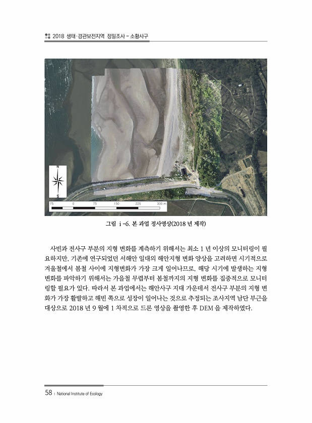 2018 생태·경관보전지역 정밀조사 소황사구 58 ? National Institute of Ecology 그림 ⅰ-6. 본 과업 정사영상 2018 년 제작 사빈과 전사구 부분의 지형 변화를 계측하기 위해서는 최소 1 년 이상의 모니터링이 필 요하지만, 기존에 연구되었던 서해안 일대의 해안지형 변화 양상을 고려하면 시기적으로 겨울철에서 봄철 사이에 지형변화가 가장 크게 일어나므로, 해당 시기에 발생하는 지형 변화를 파악하기 위해서는 가을철 무렵부터 봄철까지의 지형 변화를 집중적으로 모니터 링할 필요가 있다. 따라서 본 과업에서는 해안사구 지대 가운데서 전사구 부분의 지형 변 화가 가장 활발하고 해빈 쪽으로 성장이 일어나는 것으로 추정되는 조사지역 남단 부근을 대상으로 2018 년 9 월에 1 차적으로 드론 ...