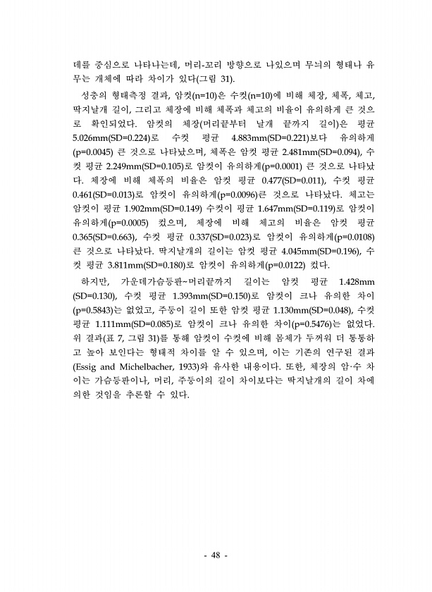 48 데를 중심으로 나타나는데, 머리-꼬리 방향으로 나있으며 무늬의 형태나 유 무는 개체에 따라 차이가 있다 그림 31 성충의 형태측정 결과, 암컷 n=10 은 수컷 n=10 에 비해 체장, 체폭, 체고, 딱지날개 길이, 그리고 체장에 비해 체폭과 체고의 비율이 유의하게 큰 것으 로 확인되었다. 암컷의 체장 머리끝부터 날개 끝까지 길이 은 평균 5.026mm SD=0.224 로 수컷 평균 4.883mm SD=0.221 보다 유의하게 p=0.0045 큰 것으로 나타났으며, 체폭은 암컷 평균 2.481mm SD=0.094 , 수 컷 평균 2.249mm SD=0.105 로 암컷이 유의하게 p=0.0001 큰 것으로 나타났 다. 체장에 비해 체폭의 비율은 암컷 평균 0.477 SD=0.011 , 수컷 평균 0.46...