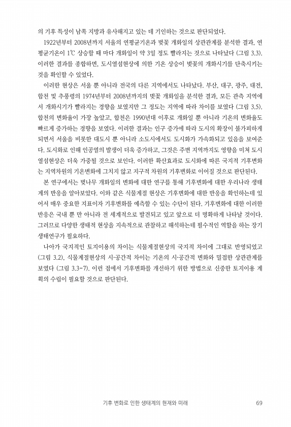 기후 변화로 인한 생태계의 현재와 미래 69 의 기후 특성이 남쪽 지방과 유사해지고 있는 데 기인하는 것으로 판단되었다. 1922년부터 2008년까지 서울의 연평균기온과 벚꽃 개화일의 상관관계를 분석한 결과, 연 평균기온이 1℃ 상승할 때 마다 개화일이 약 3일 정도 빨라지는 것으로 나타났다 그림 3.3 이러한 결과를 종합하면, 도시열섬현상에 의한 기온 상승이 벚꽃의 개화시기를 단축시키는 것을 확인할 수 있었다. 이러한 현상은 서울 뿐 아니라 전국의 다른 지역에서도 나타났다. 부산, 대구, 광주, 대전, 합천 및 추풍령의 1974년부터 2008년까지의 벚꽃 개화일을 분석한 결과, 모든 관측 지역에 서 개화시기가 빨라지는 경향을 보였지만 그 정도는 지역에 따라 차이를 보였다 그림 3.5 합천의 변화율이 가장 ...
