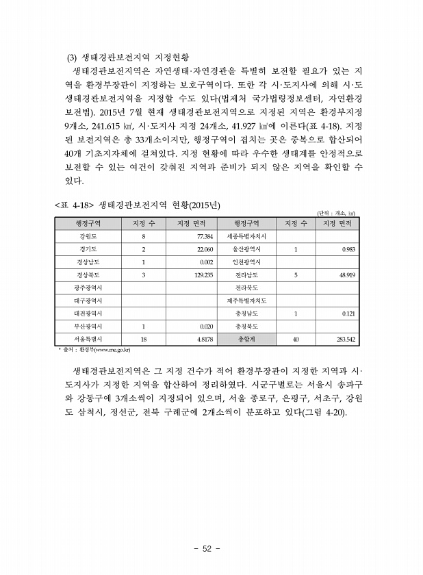 52 생태경관보전지역 지정현황 생태경관보전지역은 자연생태 자연경관을 특별히 보전할 필요가 있는 지 역을 환경부장관이 지정하는 보호구역이다 또한 각 시 도지사에 의해 시 도 생태경관보전지역을 지정할 수도 있다 법제처 국가법령정보센터 자연환경 보전법 년 월 현재 생태경관보전지역으로 지정된 지역은 환경부지정 개소 시 도지사 지정 개소 에 이른다 표 지정 된 보전지역은 총 개소이지만 행정구역이 겹치는 곳은 중복으로 합산되어 개 기초지자체에 걸쳐있다 지정 현황에 따라 우수한 생태계를 안정적으로 보전할 수 있는 여건이 갖춰진 지역과 준비가 되지 않은 지역을 확인할 수 있다 단위 개소 행정구역 지정 수 지정 면적 행정구역 지정 수 지정 면적 강원도 세종특별자치시 경기도 울산광역시 경상남도 인천광역시 경상북도 전라남도 광...