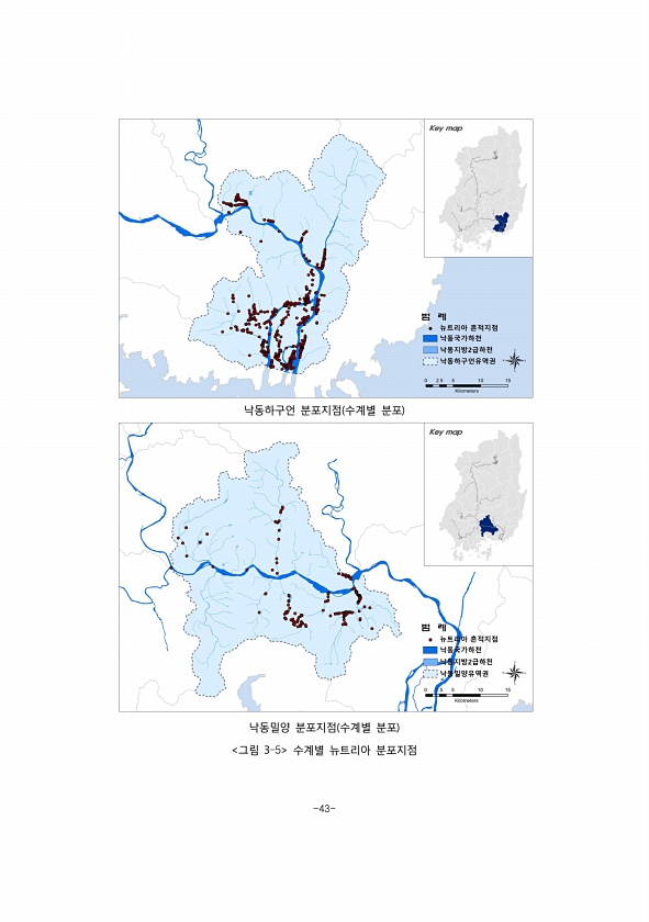 -43- 낙동하구언 분포지점 수계별 분포 낙동밀양 분포지점 수계별 분포 그림 3-5 수계별 뉴트리아분포지점