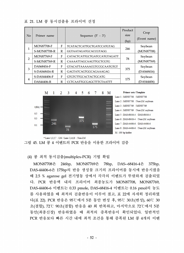 52 표 21. LM 콩 동시검출용 프라이머 선정 No Primer name Sequence 53Product size bp Crop Event name 1 MON87708-F F TCATACTCATTGCTGATCCATGTAG 246 Soybean S-MON87708-R R GGTAATAGATGCACCGTAGG MON87708 2 MON87769-F F CATACTCATTGCTGATCCATGTAGATT 78 Soybean S-MON87769-R R CAAAATTAGCAAGTTGCTCGTG MON87769 3 DAS68416-F F GTACATTAAAAACGTCCGCAATGTGT 375 Soybean S-DAS68416-R R GAGTATCAGTGGCAGAAAGAG DAS68416 4 S-DAS44406-F ...