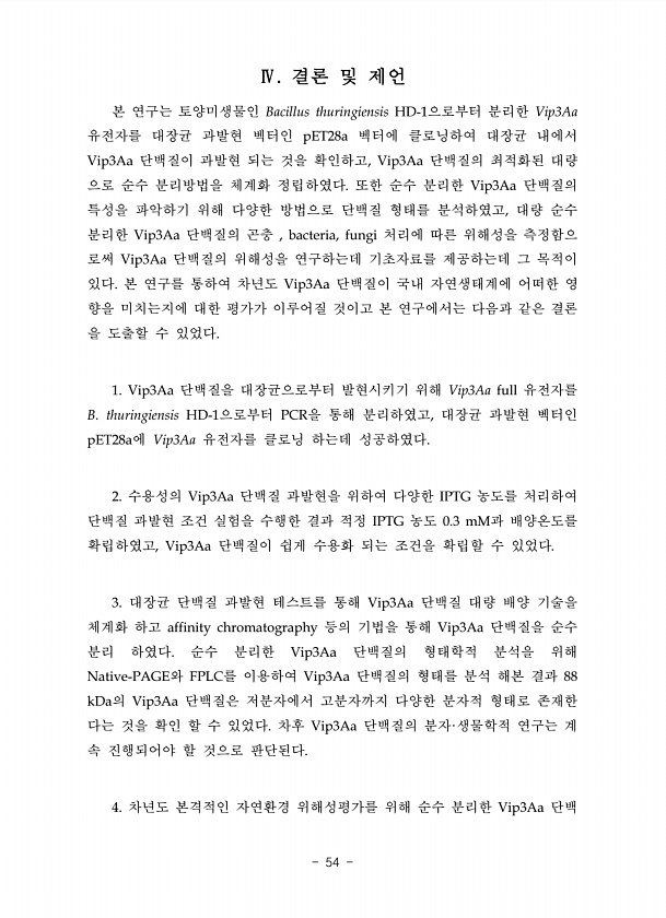 결론 및 제언 본 연구는 토양미생물인 Bacillus thuringiensis HD-1으로부터 분리한 Vip3Aa 유전자를 대장균 과발현 벡터인 pET28a 벡터에 클로닝하여 대장균 내에서 Vip3Aa 단백질이 과발현 되는 것을 확인하고, Vip3Aa 단백질의 최적화된 대량 으로 순수 분리방법을 체계화 정립하였다. 또한 순수 분리한 Vip3Aa 단백질의 특성을 파악하기 위해 다양한 방법으로 단백질 형태를 분석하였고, 대량 순수 분리한 Vip3Aa 단백질의 곤충 , bacteria, fungi 처리에 따른 위해성을 측정함으 로써 Vip3Aa 단백질의 위해성을 연구하는데 기초자료를 제공하는데 그 목적이 있다. 본 연구를 통하여 차년도 Vip3Aa 단백질이 국내 자연생태계에 어떠한 영 향을 미치는지에 대한 평가가...