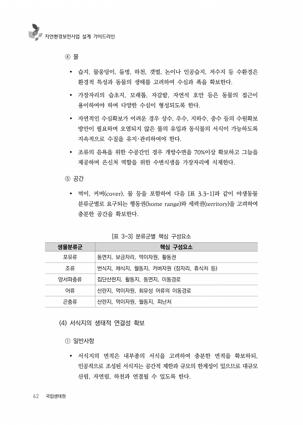 62 국립생태원 자연환경보전사업 설계 가이드라인 ④ 물 습지, 물웅덩이, 둠벙, 하천, 갯벌, 논이나 인공습지, 저수지 등 수환경은 환경적 특성과 동물의 생태를 고려하여 수심과 폭을 확보한다. 가장자리의 습초지, 모래톱, 자갈밭, 자연석 호안 등은 동물의 접근이 용이하여야 하며 다양한 수심이 형성되도록 한다. 자연적인 수심확보가 어려운 경우 상수, 우수, 지하수, 중수 등의 수원확보 방안이 필요하며 오염되지 않은 물의 유입과 동식물의 서식이 가능하도록 지속적으로 수질을 유지?관리하여야 한다. 조류의 음욕을 위한 수공간인 경우 개방수면을 70%이상 확보하고 그늘을 제공하며 은신처 역할을 위한 수변식생을 가장자리에 식재한다. ⑤ 공간 먹이, 커버 cover , 물 등을 포함하여 다음 [표 3.3-1]과 같이 야...